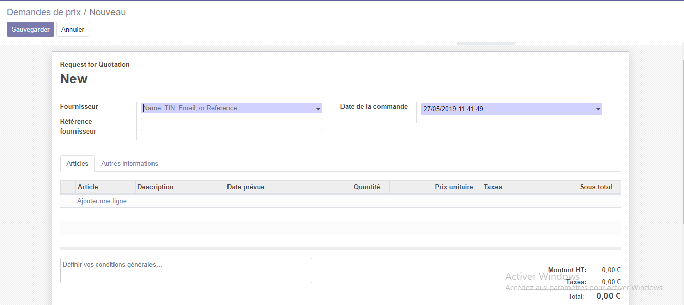 Cliquer sur créer (demandes de prix)