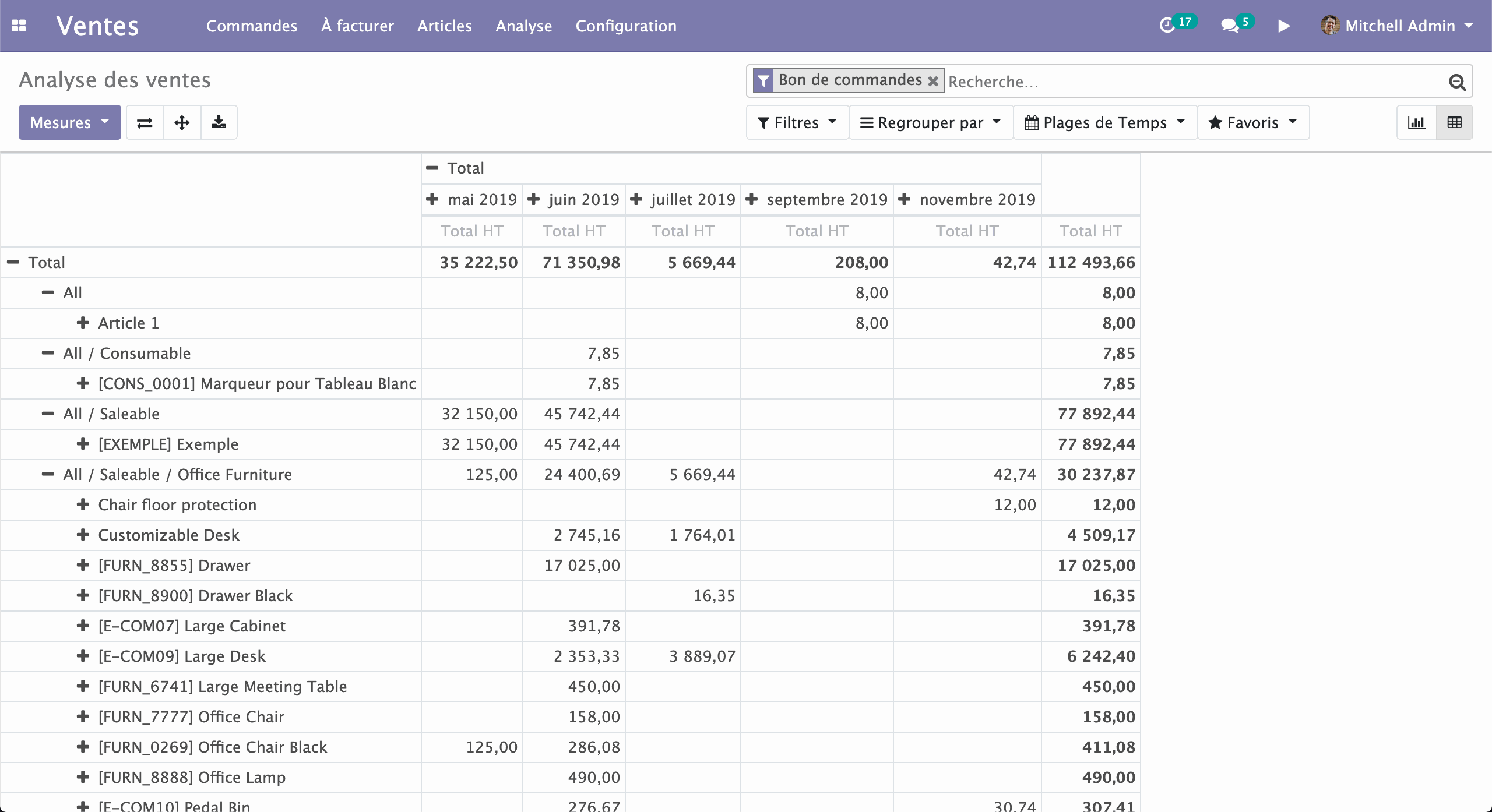 Cliquez sur le menu "Ventes" : Analyse -> Ventes afin d'accéder à l'espace dédié à l'analyse des ventes. Vous avez à disposition deux types de vues :